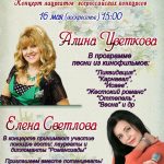 16 мая в воскресенье в 15:00 в легендарном кафе-клубе «Гнездо глухаря» состоится концерт лауреатов всероссийских конкурсов Алины Цветковой и Елены Светловой «Любимые песни из кинофильмов».